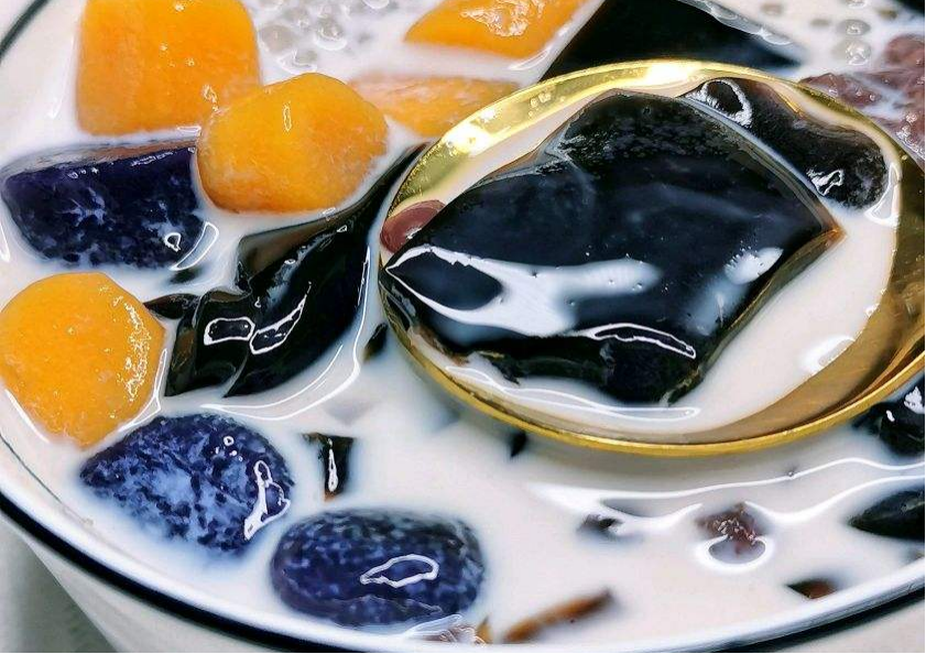 如果你能夠做到這里,我們就同時擁有了芋圓和仙草凍,但是在我們做的過程中沒有放糖,如果你干吃的話會很淡,可以配一些紅豆、煉乳、細砂糖和牛奶搭配著吃。麻煩你,芋圓仙草凍整起來吧~