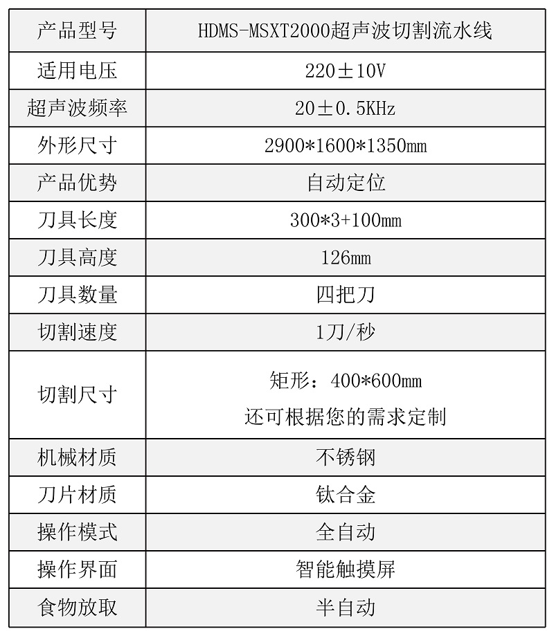 該設備配備雙把超聲波刀片,既可切方蛋糕,也可同時切兩個圓蛋糕,還具有自動上水洗刀、安全光柵的人性化功能,效率高,更方便 |